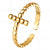 O Anel Ajustável Dourado Cruz Ponto em Aço Inoxidável Romanely é a peça ideal para quem procura um acessório elegante e simbólico. Com um design minimalista em formato de cruz com detalhe de ponto, acrescenta um toque sofisticado e discreto ao seu estilo.