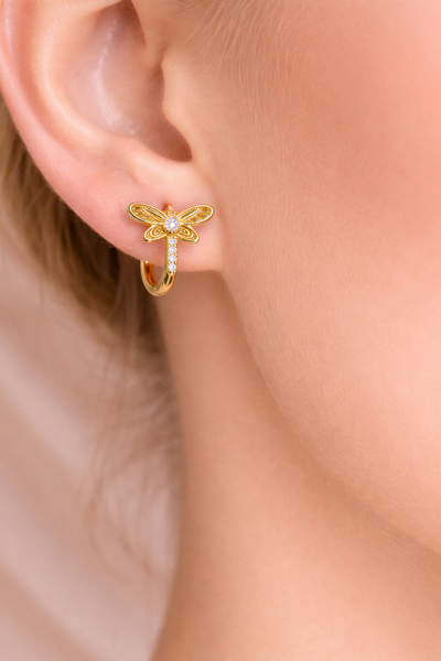 Os Brincos de Argola Dourados Libelinha com Zircónias em Aço Inoxidável Romanely são a combinação perfeita entre a estrutura clássica das argolas e a delicadeza de um design inspirado na natureza. Este modelo apresenta uma argola estilo "huggie" de onde suspende uma libelinha detalhada, cravejada com zircónias que conferem um brilho radiante e sofisticado a cada movimento.
