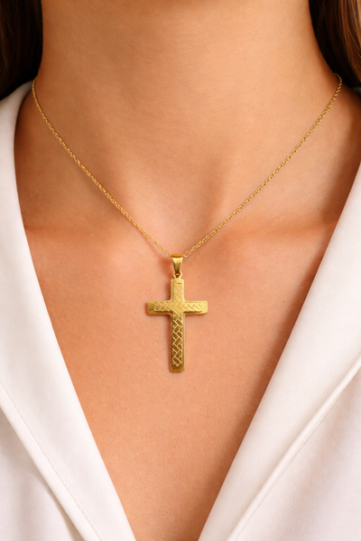 O Colar Dourado com Pingente Cruz em Aço Inoxidável Romanely é a escolha ideal para quem procura um acessório elegante com um design clássico e intemporal. Com um pendente em formato de cruz e detalhes gravados que acrescentam profundidade e sofisticação à peça, este colar destaca-se pela sua estética minimalista, sendo perfeito para complementar qualquer look do dia a dia ou ocasiões especiais.