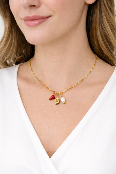 O Colar Dourado com Pingentes Concha, Pérola e Coral em Aço Inoxidável Romanely é a escolha ideal para quem procura um acessório elegante com inspiração natural e um design moderno. Com três pingentes distintos — uma concha dourada, uma pérola e um detalhe em coral vermelho — esta peça destaca-se pela sua estética delicada e harmoniosa, sendo perfeita para complementar qualquer look do dia a dia ou ocasiões especiais.