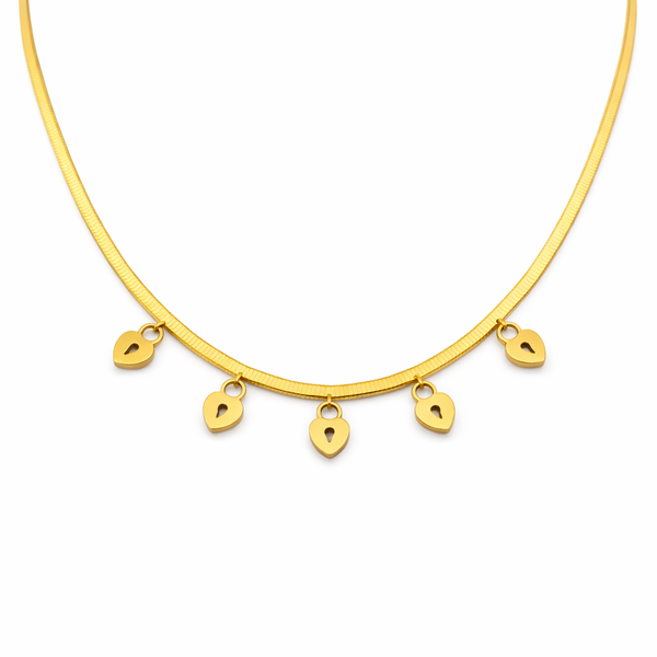 O Colar Dourado com Pingentes de Cadeado em Aço Inoxidável Romanely é o acessório ideal para quem procura um toque delicado e moderno no seu estilo. Com um design composto por múltiplos pingentes em formato de cadeado, destaca-se pela combinação entre elegância e simbolismo associado à proteção e ao amor.