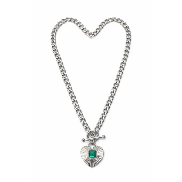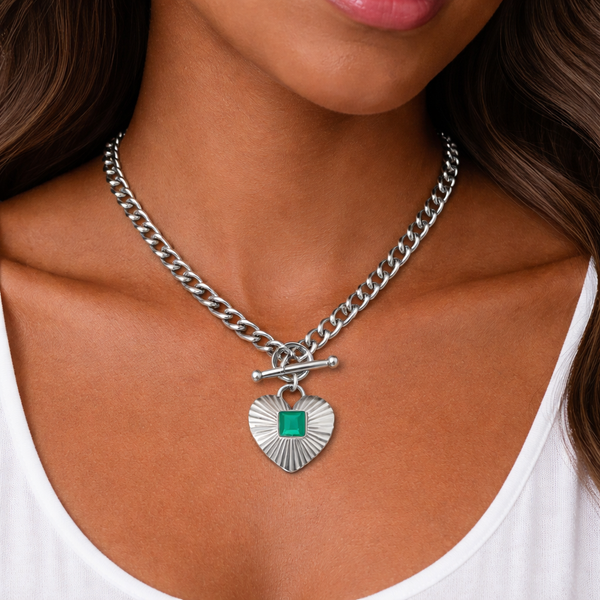O Colar Prateado com Coração e Zircónia Verde em Aço Inoxidável Romanely é o acessório ideal para quem procura um toque de elegância com personalidade. Com um design moderno, este colar apresenta um pingente em formato de coração texturizado, complementado por uma zircónia verde que adiciona um detalhe sofisticado e distintivo à peça.