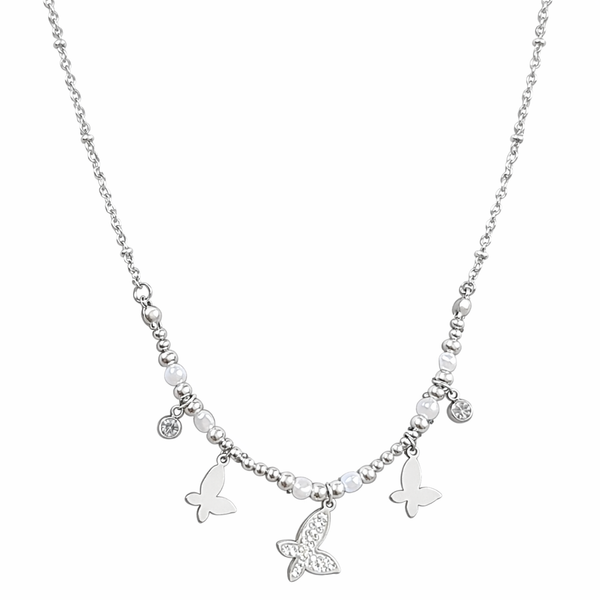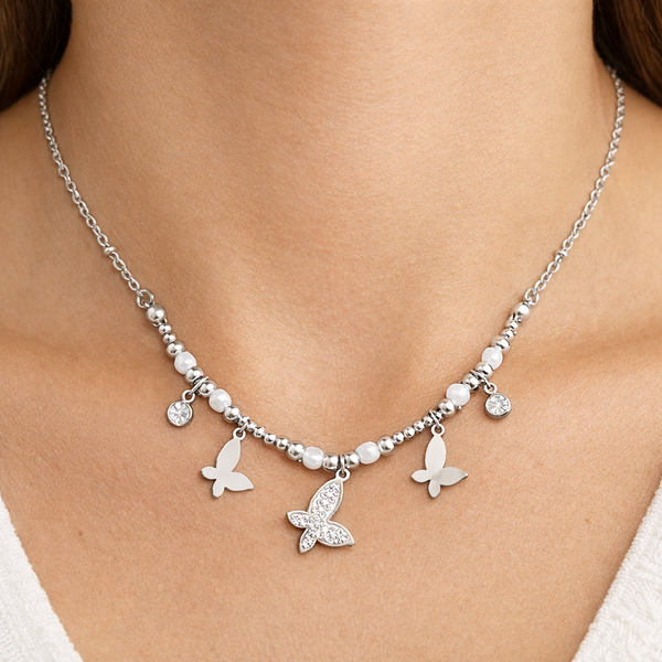 O Colar Prateado com Pingentes de Borboleta em Aço Inoxidável Romanely é o acessório ideal para quem procura um toque delicado e elegante no seu estilo. Com um design composto por borboletas e contas ornamentais, esta peça destaca-se pela sua estética leve e moderna, simbolizando transformação, liberdade e harmonia.