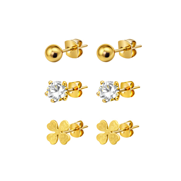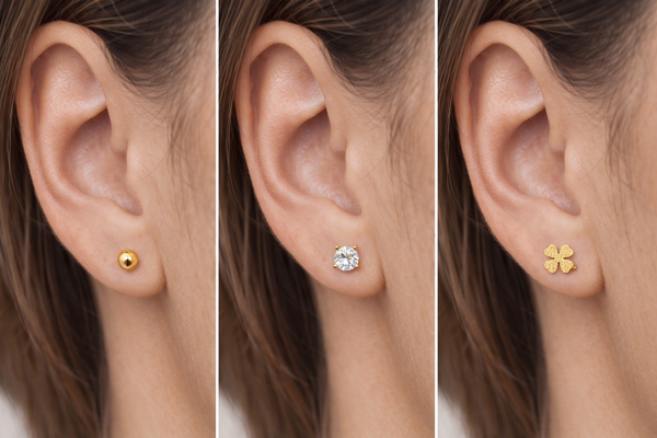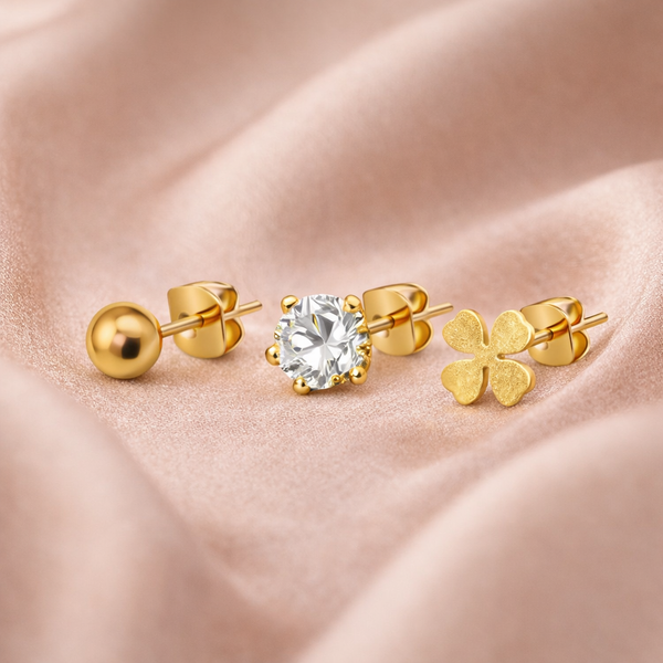 Este conjunto é a escolha ideal para criar um "ear stack" coordenado e moderno. Pode utilizar os três pares em simultâneo se tiver furos múltiplos, ou optar pelo par que melhor se adequa à ocasião: a bolinha para um look casual, o ponto de luz para um toque clássico ou o trevo para atrair boas energias com um brilho extra.