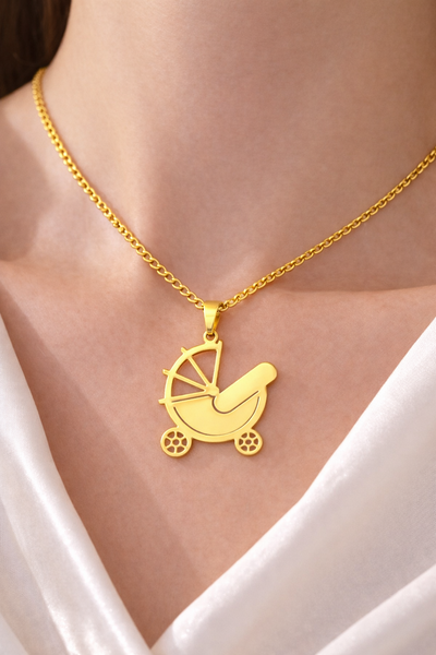 O Colar Carrinho de Bebé Dourado em Aço Inoxidável Romanely é o acessório ideal para quem procura um toque delicado e simbólico no seu estilo. Com um design em formato de carrinho de bebé, destaca-se pelo seu significado especial associado à maternidade, amor e novos começos.
