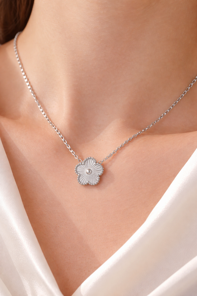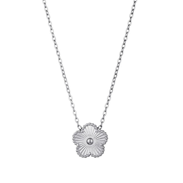 O Colar Flor da Sorte Prateado em Aço Inoxidável Romanely é o acessório ideal para quem procura um toque delicado e simbólico no seu estilo. Com um design em formato de flor de cinco pétalas, destaca-se pela combinação entre elegância minimalista e significado associado à sorte e harmonia.