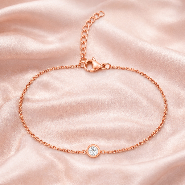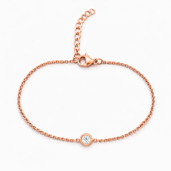 A Tornozeleira Rose Gold com Zircónia em Aço Inoxidável Romanely é uma peça de elegância contemporânea que une a delicadeza do tom rosado à sofisticação de um ponto de luz clássico. Este design apresenta uma corrente fina e fluida que envolve o tornozelo com suavidade, destacando-se pela aplicação de uma zircónia de lapidação brilhante que capta e reflete a luz a cada passo, conferindo um brilho luxuoso e discreto.