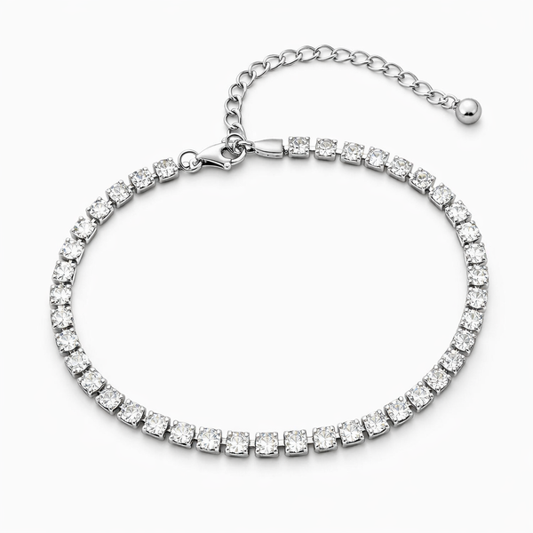 A Tornozeleira Strass Prateada com Zircónias em Aço Inoxidável Romanely é uma peça de brilho intenso e elegância magnética, desenhada para quem deseja destacar-se com um acessório de luxo. Este design apresenta uma sequência contínua de zircónias meticulosamente cravejadas, criando um efeito de "rio de luz" que envolve o tornozelo. O contraste entre o acabamento prateado frio e o reflexo cristalino das pedras evoca a sofisticação da alta joalharia numa peça moderna e resistente.